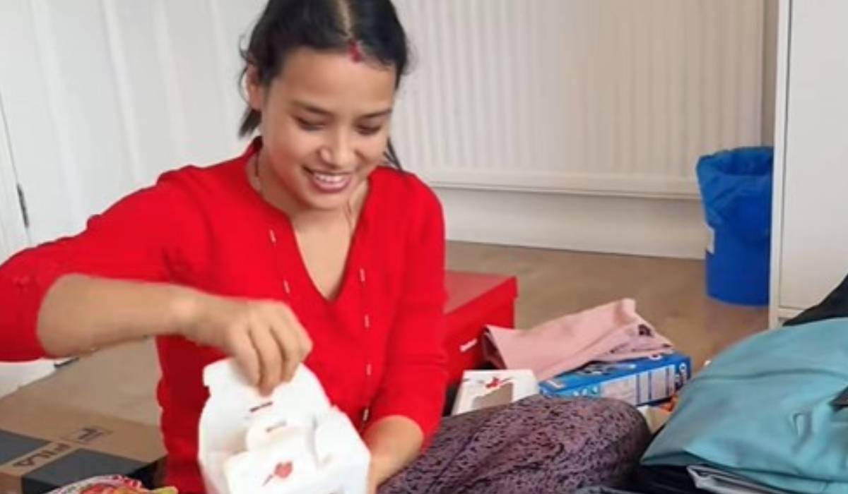Tânăra nepaleză s-a așezat pe podeaua locuinței din Marea Britanie, alături de mai multe cutii de bomboane, o valiza, haine și jucării. În imaginile postate pe TikTok se vede cum desface fiecare cutie de bomboane Raffaello și le așează în valiză.